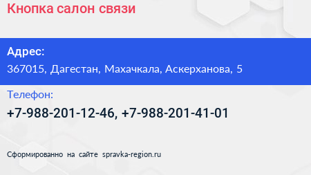 Кнопка, салон связи по адресу 367015, Дагестан, Махачкала, Аскерханова, 5 в дальнейшем Организация, размещена в следующих категориях: