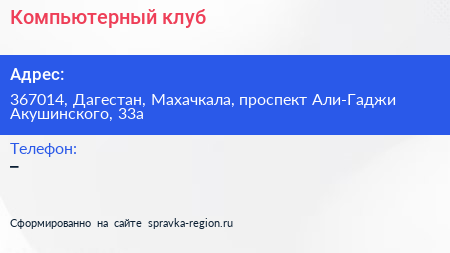 Компьютерный клуб по адресу 367014, Дагестан, Махачкала, проспект Али-Гаджи Акушинского, 33а в дальнейшем Организация, размещена в следующих категориях: