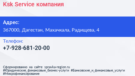 Ksk Service, компания по адресу 367000, Дагестан, Махачкала, Радищева, 4 в дальнейшем Организация, размещена в следующих категориях: