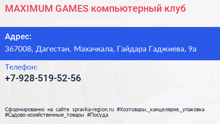 MAXIMUM GAMES, компьютерный клуб по адресу 367008, Дагестан, Махачкала, Гайдара Гаджиева, 9а в дальнейшем Организация, размещена в следующих категориях: