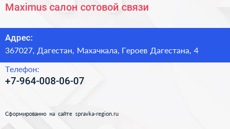 Maximus, салон сотовой связи по адресу 367027, Дагестан, Махачкала, Героев Дагестана, 4 в дальнейшем Организация, размещена в следующих категориях: