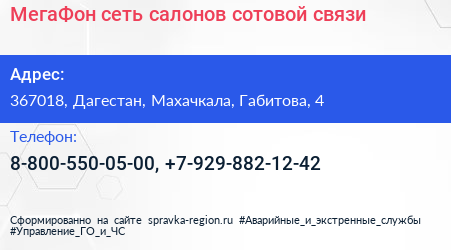 МегаФон, сеть салонов сотовой связи по адресу 367018, Дагестан, Махачкала, Габитова, 4 в дальнейшем Организация, размещена в следующих категориях: