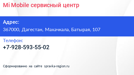 Mi Mobile, сервисный центр по адресу 367000, Дагестан, Махачкала, Батырая, 107 в дальнейшем Организация, размещена в следующих категориях: