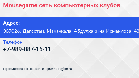 Mousegame, сеть компьютерных клубов по адресу 367026, Дагестан, Махачкала, Абдулхакима Исмаилова, 43 в дальнейшем Организация, размещена в следующих категориях:
