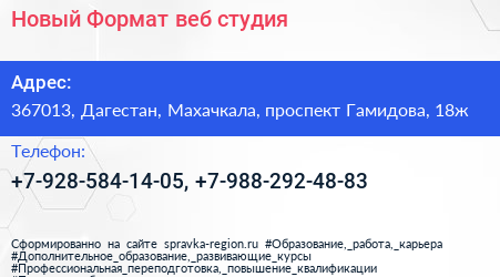 Новый Формат, веб-студия по адресу 367013, Дагестан, Махачкала, проспект Гамидова, 18ж в дальнейшем Организация, размещена в следующих категориях: