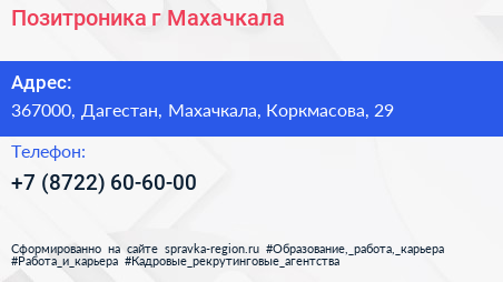 Позитроника, г. Махачкала по адресу 367000, Дагестан, Махачкала, Коркмасова, 29 в дальнейшем Организация, размещена в следующих категориях: