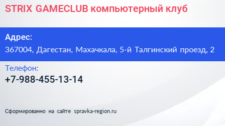 STRIX GAMECLUB, компьютерный клуб по адресу 367004, Дагестан, Махачкала, 5-й Талгинский проезд, 2 в дальнейшем Организация, размещена в следующих категориях: