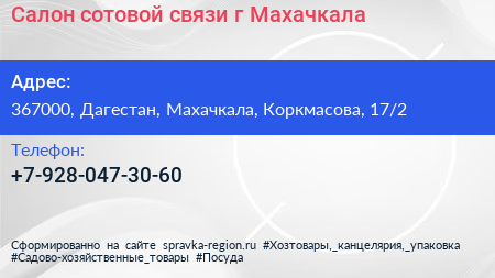 Салон сотовой связи, г. Махачкала по адресу 367000, Дагестан, Махачкала, Коркмасова, 17/2 в дальнейшем Организация, размещена в следующих категориях: