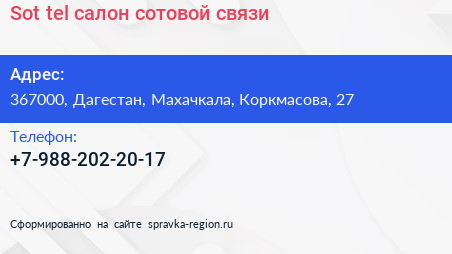 Sot tel, салон сотовой связи по адресу 367000, Дагестан, Махачкала, Коркмасова, 27 в дальнейшем Организация, размещена в следующих категориях: