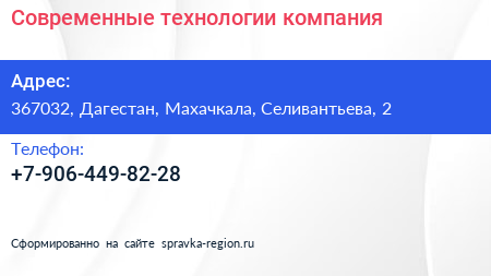 Современные технологии, компания по адресу 367032, Дагестан, Махачкала, Селивантьева, 2 в дальнейшем Организация, размещена в следующих категориях: