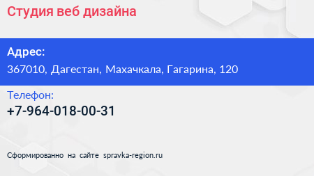 Студия веб-дизайна по адресу 367010, Дагестан, Махачкала, Гагарина, 120 в дальнейшем Организация, размещена в следующих категориях: