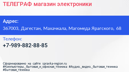 ТЕЛЕГРАФ, магазин электроники по адресу 367003, Дагестан, Махачкала, Магомеда Ярагского, 68 в дальнейшем Организация, размещена в следующих категориях: