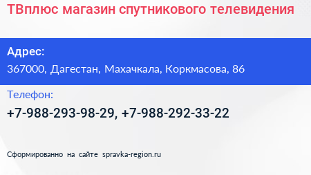ТВплюс, магазин спутникового телевидения по адресу 367000, Дагестан, Махачкала, Коркмасова, 86 в дальнейшем Организация, размещена в следующих категориях: