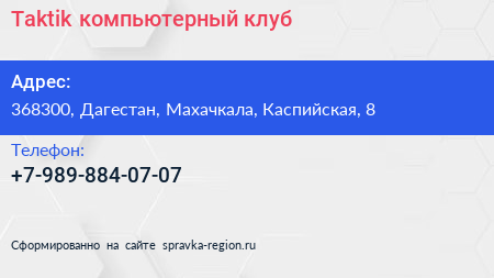 Taktik, компьютерный клуб по адресу 368300, Дагестан, Махачкала, Каспийская, 8 в дальнейшем Организация, размещена в следующих категориях: