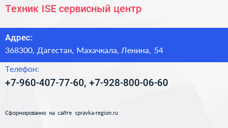 Техник-ISE, сервисный центр по адресу 368300, Дагестан, Махачкала, Ленина, 54 в дальнейшем Организация, размещена в следующих категориях: