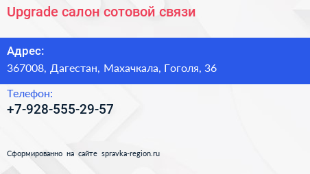 Upgrade, салон сотовой связи по адресу 367008, Дагестан, Махачкала, Гоголя, 36 в дальнейшем Организация, размещена в следующих категориях:
