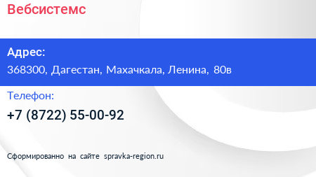 Вебсистемс по адресу 368300, Дагестан, Махачкала, Ленина, 80в в дальнейшем Организация, размещена в следующих категориях: