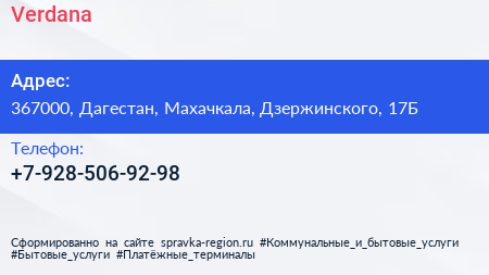 Verdana по адресу 367000, Дагестан, Махачкала, Дзержинского, 17Б в дальнейшем Организация, размещена в следующих категориях: