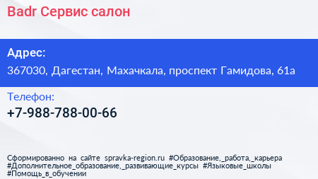 Badr Сервис, салон по адресу 367030, Дагестан, Махачкала, проспект Гамидова, 61а в дальнейшем Организация, размещена в следующих категориях: