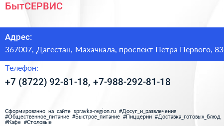 БытСЕРВИС по адресу 367007, Дагестан, Махачкала, проспект Петра Первого, 83 в дальнейшем Организация, размещена в следующих категориях: