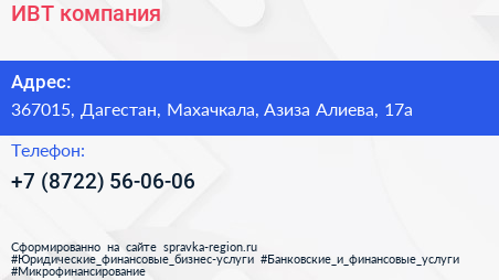 ИВТ, компания по адресу 367015, Дагестан, Махачкала, Азиза Алиева, 17а в дальнейшем Организация, размещена в следующих категориях: