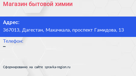 Магазин бытовой химии по адресу 367013, Дагестан, Махачкала, проспект Гамидова, 13 в дальнейшем Организация, размещена в следующих категориях: