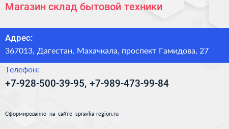 Магазин-склад бытовой техники по адресу 367013, Дагестан, Махачкала, проспект Гамидова, 27 в дальнейшем Организация, размещена в следующих категориях: