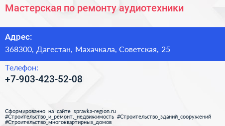 Мастерская по ремонту аудиотехники по адресу 368300, Дагестан, Махачкала, Советская, 25 в дальнейшем Организация, размещена в следующих категориях: