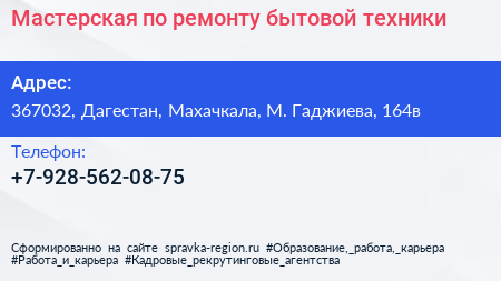 Мастерская по ремонту бытовой техники по адресу 367032, Дагестан, Махачкала, М. Гаджиева, 164в в дальнейшем Организация, размещена в следующих категориях: