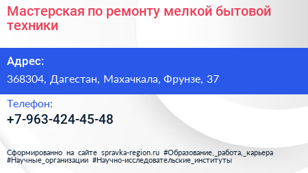 Мастерская по ремонту мелкой бытовой техники по адресу 368304, Дагестан, Махачкала, Фрунзе, 37 в дальнейшем Организация, размещена в следующих категориях: