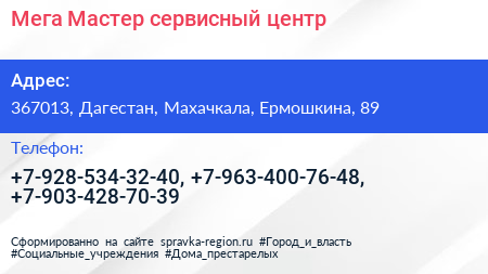 Мега Мастер, сервисный центр по адресу 367013, Дагестан, Махачкала, Ермошкина, 89 в дальнейшем Организация, размещена в следующих категориях: