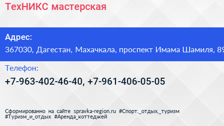 ТехНИКС, мастерская по адресу 367030, Дагестан, Махачкала, проспект Имама Шамиля, 89 в дальнейшем Организация, размещена в следующих категориях: