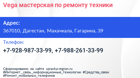 Vega, мастерская по ремонту техники по адресу 367010, Дагестан, Махачкала, Гагарина, 39 в дальнейшем Организация, размещена в следующих категориях: