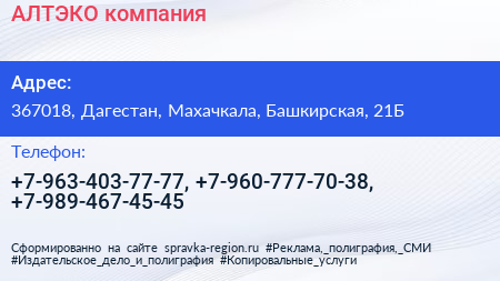 АЛТЭКО, компания по адресу 367018, Дагестан, Махачкала, Башкирская, 21Б в дальнейшем Организация, размещена в следующих категориях: