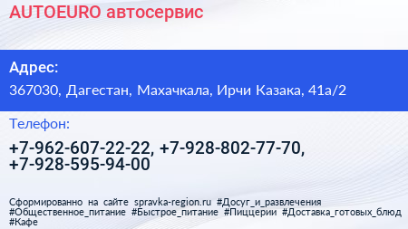 AUTOEURO, автосервис по адресу 367030, Дагестан, Махачкала, Ирчи Казака, 41а/2 в дальнейшем Организация, размещена в следующих категориях: