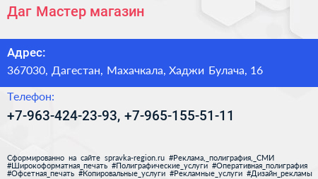 Даг Мастер, магазин по адресу 367030, Дагестан, Махачкала, Хаджи Булача, 16 в дальнейшем Организация, размещена в следующих категориях: