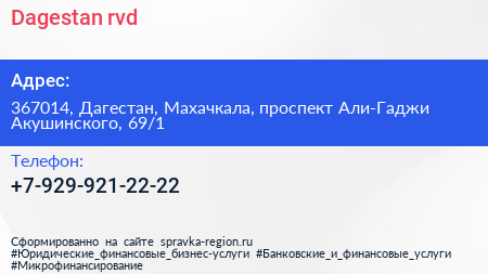 Dagestan rvd по адресу 367014, Дагестан, Махачкала, проспект Али-Гаджи Акушинского, 69/1 в дальнейшем Организация, размещена в следующих категориях: