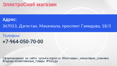 ЭлектроСнаб, магазин по адресу 367013, Дагестан, Махачкала, проспект Гамидова, 18/3 в дальнейшем Организация, размещена в следующих категориях: