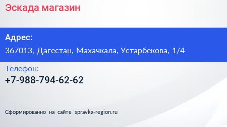 Эскада, магазин по адресу 367013, Дагестан, Махачкала, Устарбекова, 1/4 в дальнейшем Организация, размещена в следующих категориях:
