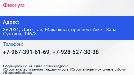 Фектум по адресу 367031, Дагестан, Махачкала, проспект Амет-Хана Султана, 146/3 в дальнейшем Организация, размещена в следующих категориях: