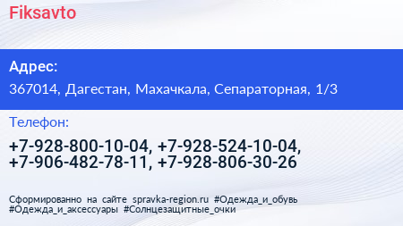 Fiksavto по адресу 367014, Дагестан, Махачкала, Сепараторная, 1/3 в дальнейшем Организация, размещена в следующих категориях: