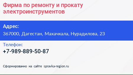 Фирма по ремонту и прокату электроинструментов по адресу 367000, Дагестан, Махачкала, Нурадилова, 23 в дальнейшем Организация, размещена в следующих категориях: