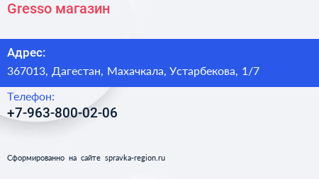 Gresso, магазин по адресу 367013, Дагестан, Махачкала, Устарбекова, 1/7 в дальнейшем Организация, размещена в следующих категориях: