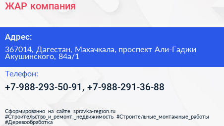 ЖАР, компания по адресу 367014, Дагестан, Махачкала, проспект Али-Гаджи Акушинского, 84а/1 в дальнейшем Организация, размещена в следующих категориях: