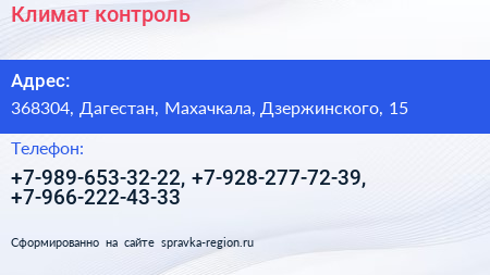 Климат контроль по адресу 368304, Дагестан, Махачкала, Дзержинского, 15 в дальнейшем Организация, размещена в следующих категориях: