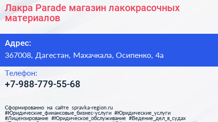 Лакра Parade, магазин лакокрасочных материалов по адресу 367008, Дагестан, Махачкала, Осипенко, 4а в дальнейшем Организация, размещена в следующих категориях: