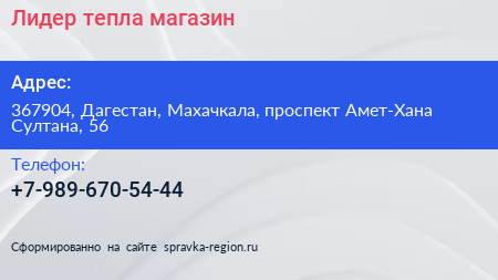 Лидер тепла, магазин по адресу 367904, Дагестан, Махачкала, проспект Амет-Хана Султана, 56 в дальнейшем Организация, размещена в следующих категориях: