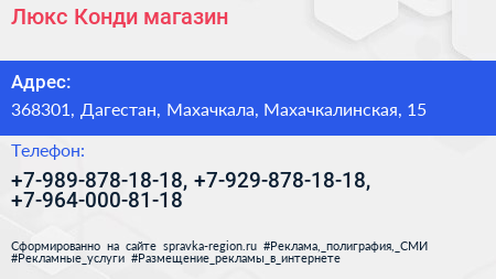 Люкс Конди, магазин по адресу 368301, Дагестан, Махачкала, Махачкалинская, 15 в дальнейшем Организация, размещена в следующих категориях: