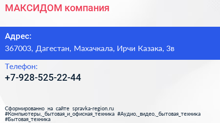 МАКСИДОМ, компания по адресу 367003, Дагестан, Махачкала, Ирчи Казака, 3в в дальнейшем Организация, размещена в следующих категориях: