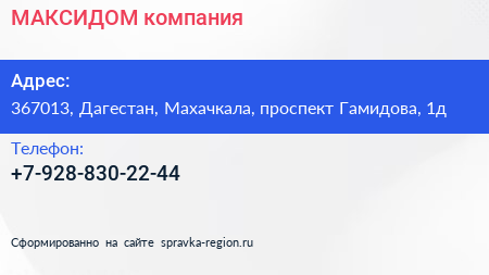 МАКСИДОМ, компания по адресу 367013, Дагестан, Махачкала, проспект Гамидова, 1д в дальнейшем Организация, размещена в следующих категориях: